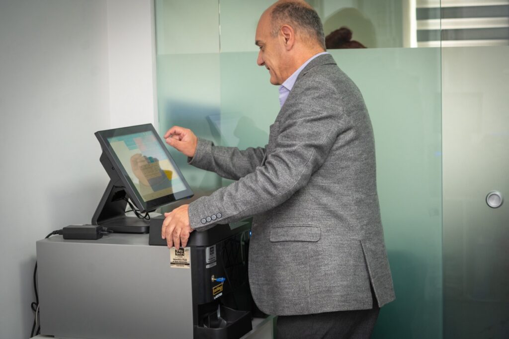 Dr Charles Attard operating Malta’s first Cashlogy system at Juanafil in 2016, marking the start of a decade of automated cash management in local retail.